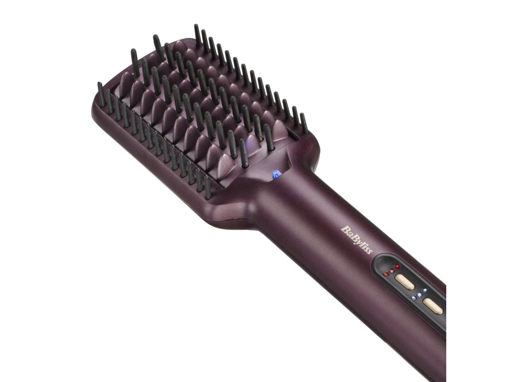 - Dokonalé uhladenie – kefka kombinuje keramické uhladzovacie a narovnávacie doštičky so silikónovými hrotmi, ktoré vlasy dokonale rozčesávajú bez ťahania.