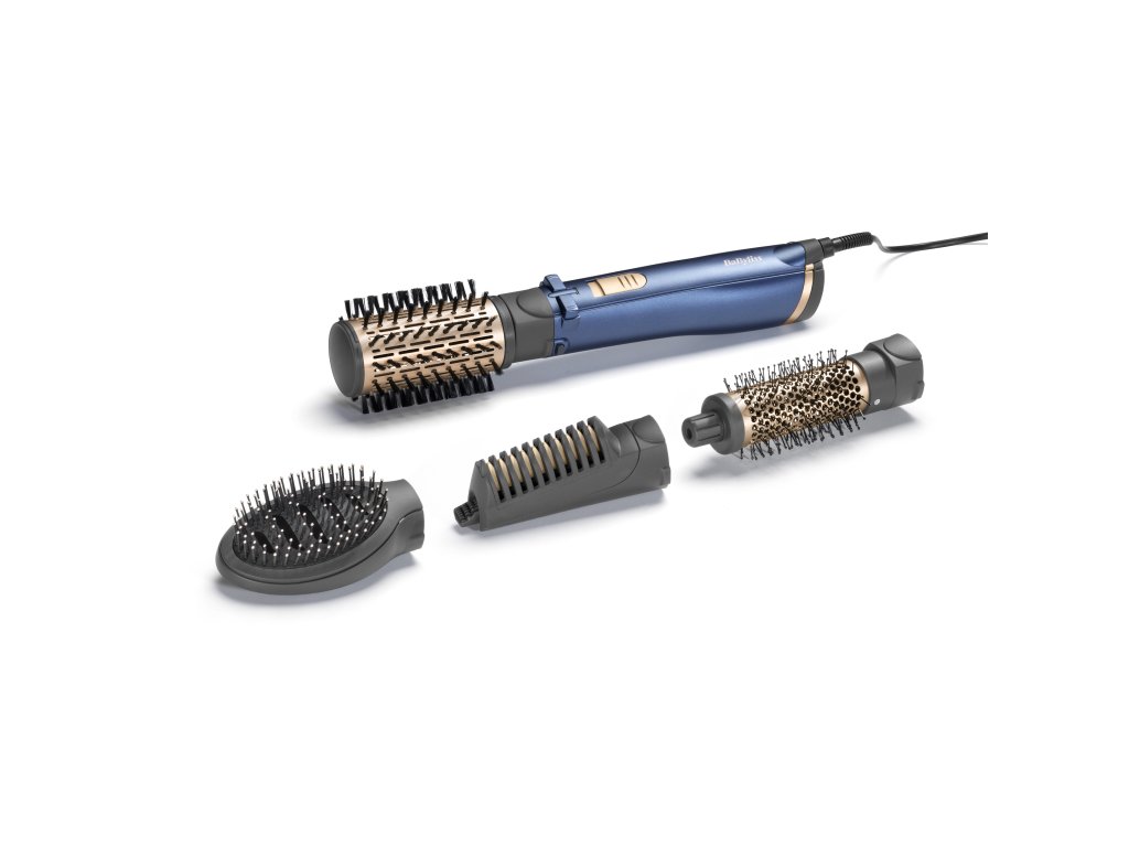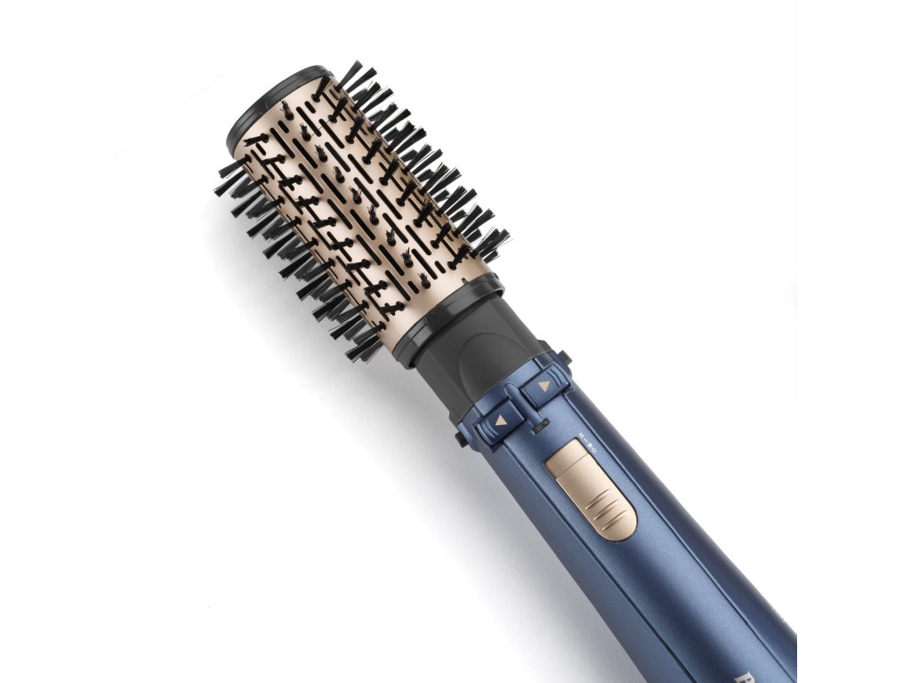 Výkonný 1000 W rotačný kulmofén pre ultra rýchle vysúšanie a styling. V balení so 4 vymeniteľnými nástavcami na vysúšanie, dodávanie objemu, uhladenie a vyrovnávanie vlasov. S funkciou ionizácie a cestovným puzdom. V luxusnom zlato-modrom prevedení.