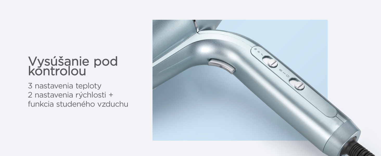 Sušič má odnímateľný zadný filter pre ľahké čistenie, 3 možnosti nastavenia teploty, 2 nastavenia rýchlosti prúdenia vzduchu a spínač studeného vzduchu.
