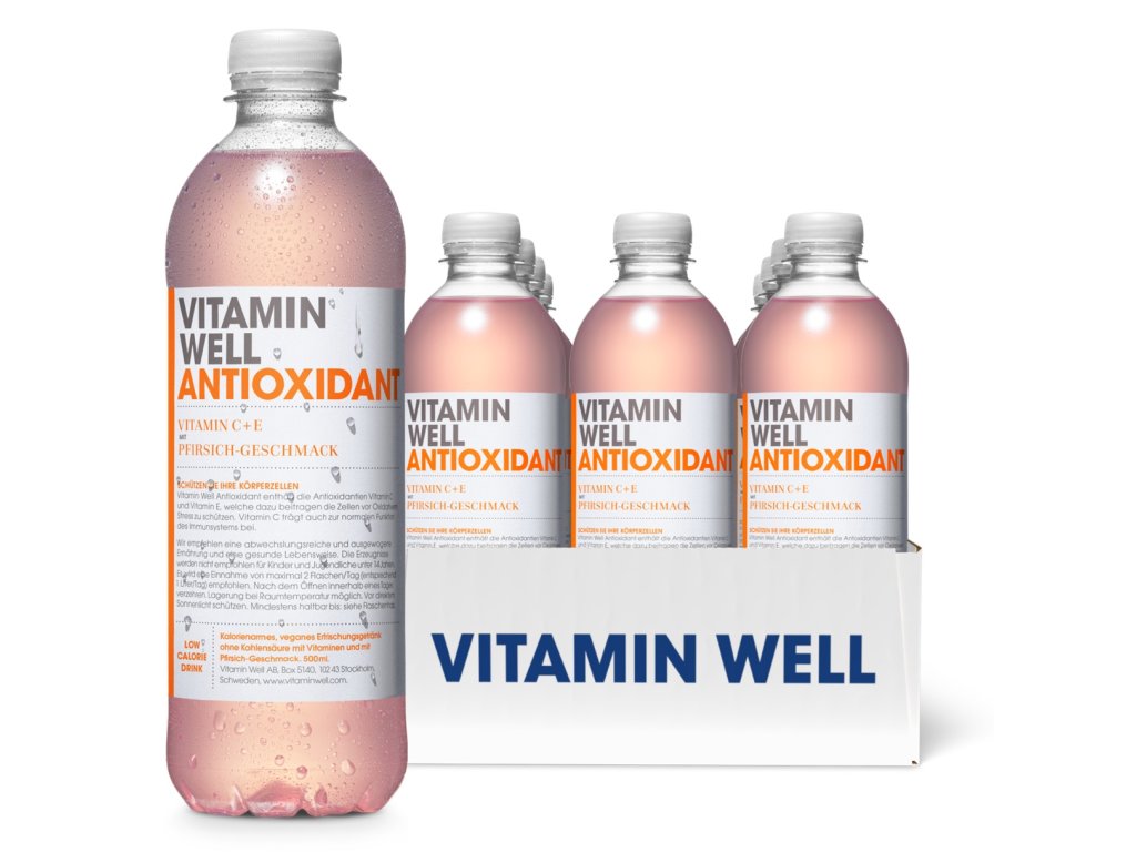 Vitamin Well Antioxidant s príchuťou broskyně obsahuje antioxidanty vitamín C a E, plus minerálne látky selén, mangán a zinok, ktoré prispievajú k ochrane buniek pred oxidačným stresom. Vitamín C a zinok tiež prispievajú k správnemu fungovaniu imunitného systému. Vitamin Well Antioxidant je neperlivý, nízkoenergetický nápoj, bez konzervačných látok, obohatený o vitamíny a minerálne látky.