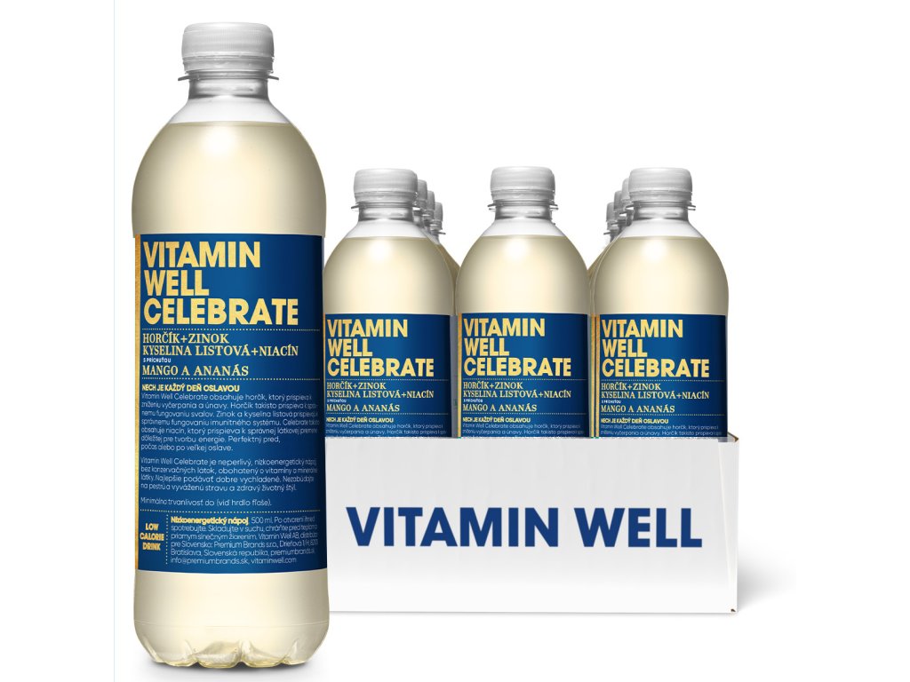 Vitamin Well Celebrate s príchuťou manga a ananásu obsahuje horčík, ktorý prispieva k zníženiu vyčerpania a únavy. Horčík takisto prispieva k správnemu fungovaniu svalov. Zinok a kyselina listová prispievajú k správnemu fungovaniu imunitného systému. Celebrate takisto obsahuje niacín, ktorý prispieva k správnej látkovej premene dôležitej pre tvorbu energie. Perfektný pred, počas alebo po veľkej oslave. Vitamin Well Celebrate je neperlivý, nízkoenergetický nápoj, bez konzervačných látok, obohatený o vitamíny a minerálne látky.